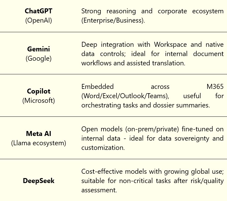 Practical tip: For sensitive tasks (e.g. claims, experimental data), prioritize corporate plans or private deployments (zero retention, audit trails, SSO, DPAs), and establish a clear positive-use list (screening, drafting, analytics) versus red-flagged uses (automated decisions, uncontracted data submission).