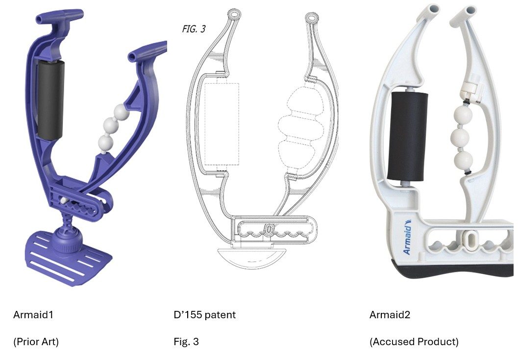 Armaid started selling its Armaid1 product, a massaging apparatus for the arms, in the 1990s. (See Armaid1 image below). In 2016, Terry Cross, the late President of Armaid, Nic Bartolotta, and Brian Stahl, the then and current CEO of RoM, formed RoM for the purpose of developing and selling the Rolflex. On 25 May 2016, RoM filed a design patent application, naming Terry Cross as the sole inventor. The patent issued as the D’155 patent on 7 November 2017. (Figure 3 from the D’155 patent is shown below.) RoM did not file any additional design patent applications to protect the visual appearance of its Rolflex product. In 2019, after a falling out between Mr. Cross and RoM, Mr. Cross renewed his focus on Armaid, which launched its Armaid2 product in late 2020. In late 2021, Mr. Cross died in an accident. Months later, on 8 April 2022, RoM sued Armaid in the District of Maine, alleging that Armaid infringed the D’155 patent by making and selling its Armaid2 product. (See below for an image of the Armaid2.)