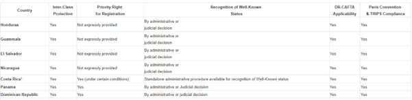 Please find below and for your easiness and ready availability a COMPARATIVE TABLE on the Legal Protection of Well-Known Trademarks in Central America and the Dominican Republic.